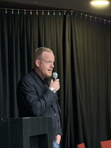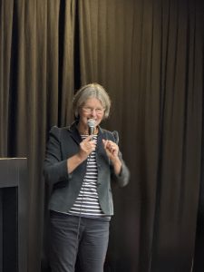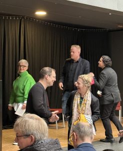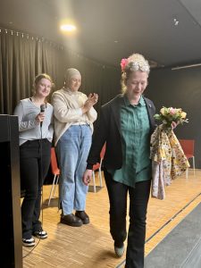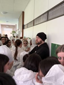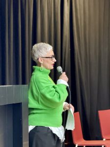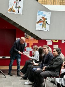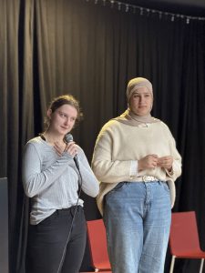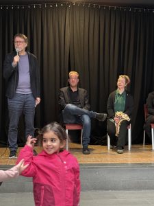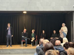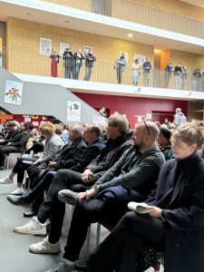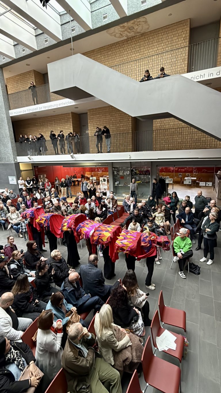Die Veranstaltung begann im Forum der MLKS. Nach der Begrüßung durch Kunstlehrer Marcel Schröder, der den Ablauf der bevorstehenden Performance erklärte, richteten Claudia Schwidrik-Grebe, Birgit Sauer und unsere Schulleiterin Claudia Buchartowski herzliche Grußworte an die Gäste. Anschließend begrüßte Museumsdirektor Georg Elben das Publikum und lud vier Schüler:innen zu einem kurzen Gespräch über die offiziellen Ausstellungsplakate ein. Die selbst gestalteten Collage-Poster hatten die Ausstellung visuell geprägt, ihre Entstehungsideen aus Schülerhand zu hören, war ein besonderer Moment.