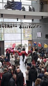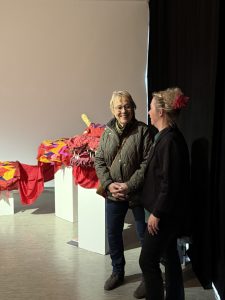 Dann wurde es spektakulär: Zur Musik aus Camille Saint-Saëns’ „Karneval der Tiere“ zog der große rote Drache ins Forum ein. Sieben Schüler:innen trugen die eindrucksvolle Figur, die im Kunstunterricht von Julia Heinrich entstanden war, und führten einen eigenen Tanz auf. Anschließend „führte“ der Drache das Publikum symbolisch in das Skulpturenmuseum hinüber, wo die Ausstellung offiziell eröffnet wurde.