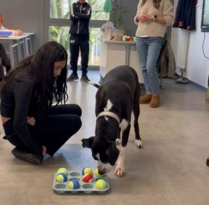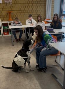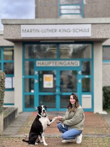 Arko begleitet seine Bezugsperson die Lehrkraft Hannah Surmann regelmäßig in ausgewählte Klassen und sorgt dort für Ruhe, Motivation und viele fröhliche Momente.