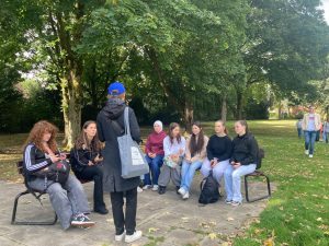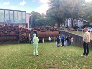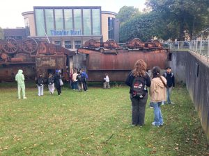 Während des Spaziergangs hörten die Schüler:innen Geschichten mit dem Titel „Entstaubung“. Diese Geschichten stammen eigentlich aus einer Ausstellung im Skulpturenmuseum Marl, wirken draußen in der Stadt aber noch einmal ganz anders. So entsteht ein spannender Zusammenhang zwischen den Erzählungen und den Orten, an denen man gerade steht.