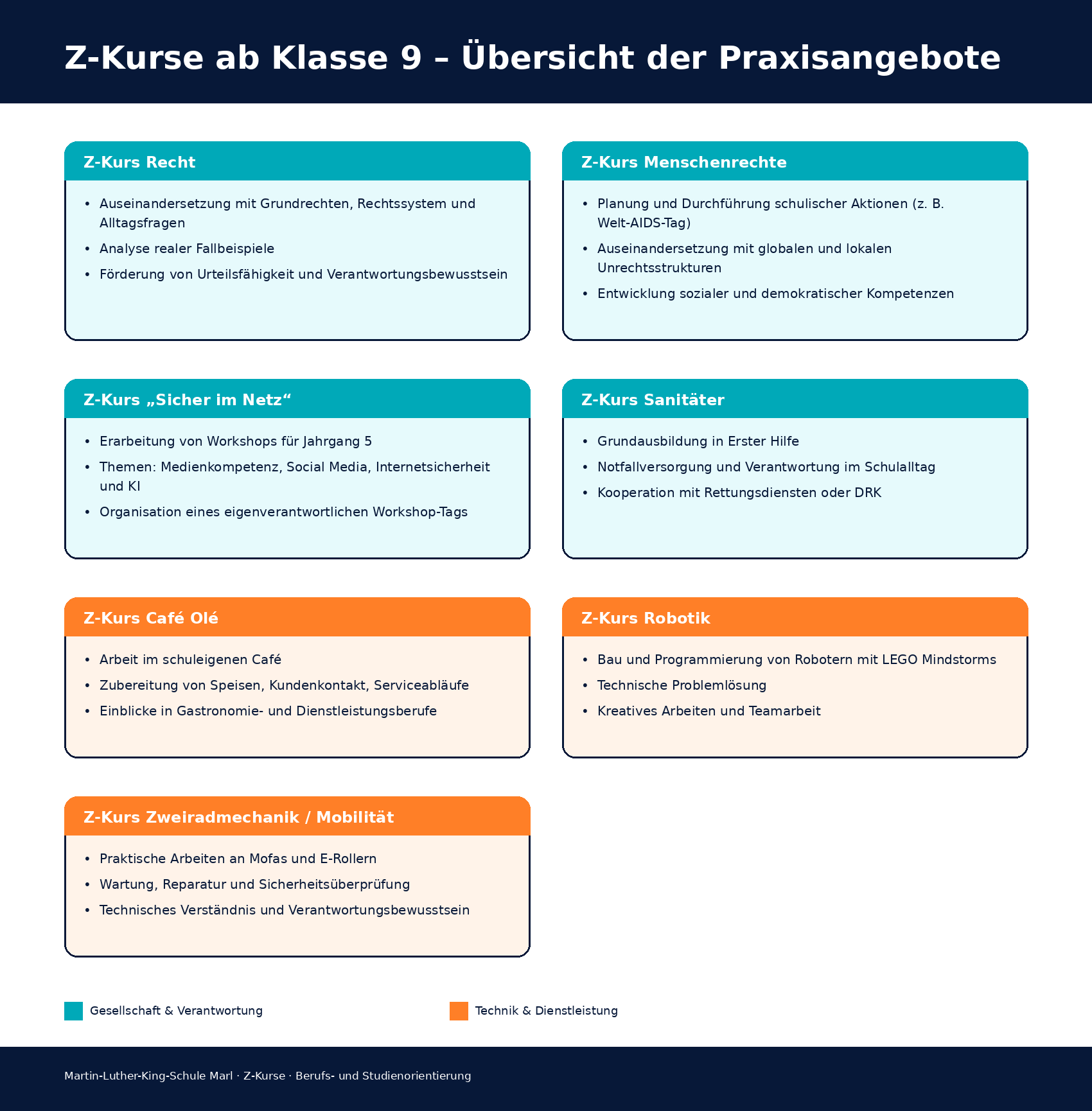 Die Z-Kurse der MLKS bilden einen verbindlichen Praxisteil der schulischen Beruflichen Orientierung und ermöglichen den Schüler:innen ab der Mittelstufe, ihre Interessen in konkreten Arbeits- und Lebensfeldern zu erproben. Sie sind fest im BO-Gesamtkonzept verankert und ergänzen die KAoA-Bausteine durch kontinuierliche, handlungsorientierte Lerngelegenheiten.
